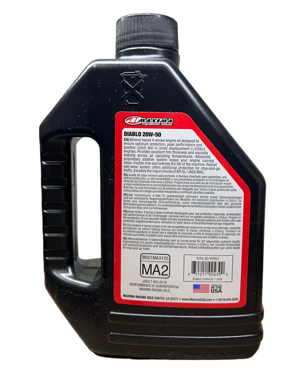 ACEITE MINERAL MAXIMA DIABLO 20W50 Diseñado para garantizar una protección óptima, un rendimiento máximo y una sensación de embrague espectacular en motores de mediana y baja cilindrada (<250cc). El avanzado sistema de aditivos patentado mantiene su motor funcionando limpio, sin problemas y extiende la vida útil de la máquina. Supera los requisitos de API SL / JASO MA2.