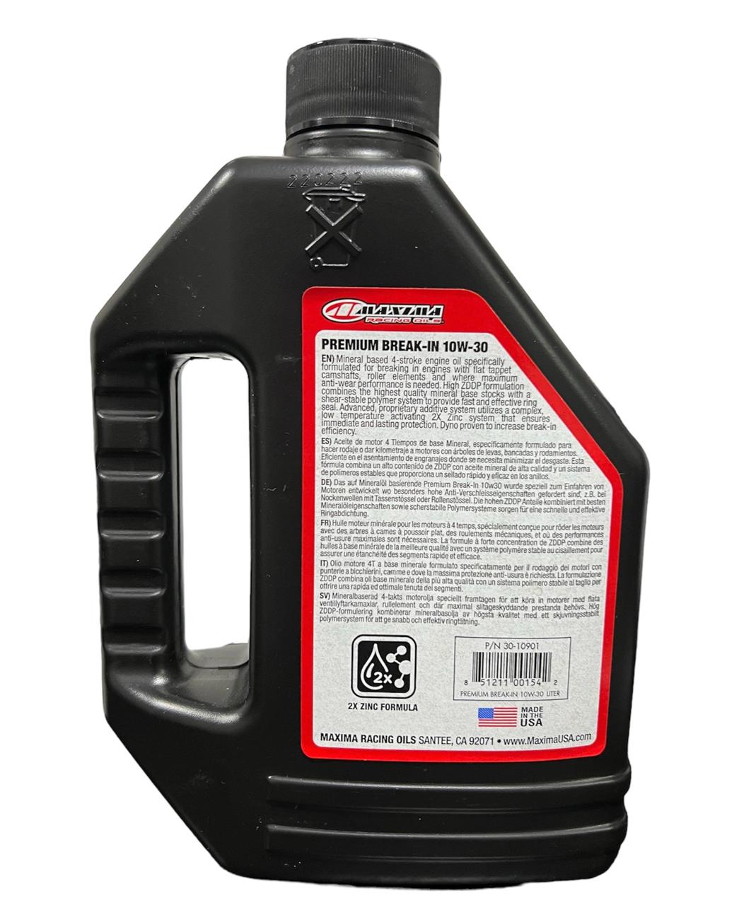 ACEITE MINERAL PARA DESPEGUE DE MOTORES MAXIMA BREAK IN 10W30 Formulado específicamente para el funcionamiento inicial en motores, donde se necesita el máximo rendimiento anti desgaste. La formulación de alta ZDDP combina las existencias de base mineral de la más alta calidad con un sistema de polímero estable al corte para proporcionar un sellado de anillo rápido y efectivo. El avanzado sistema de aditivos patentado utiliza un complejo sistema de zinc 2X activador a baja temperatura que garantiza una protección inmediata y duradera. Dyno ha demostrado que aumenta la eficiencia del rodaje.
