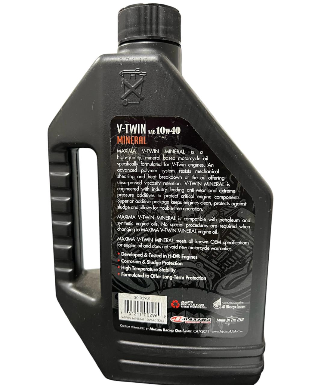 ACEITE MINERAL PARA MOTOS V-TWIN MAXIMA V-TWIN 10W40 Específicamente formulado para motores V-Twin. La formulación estable al cizallamiento proporciona un excelente espesor de película y estabilidad de la viscosidad en todas las temperaturas de funcionamiento. El avanzado sistema de aditivos patentado con protección anti desgaste y presión extrema líder en la industria mantiene su motor funcionando limpio, sin problemas y prolonga la vida útil de la máquina. Supera los requisitos de API SL / JASO MA2