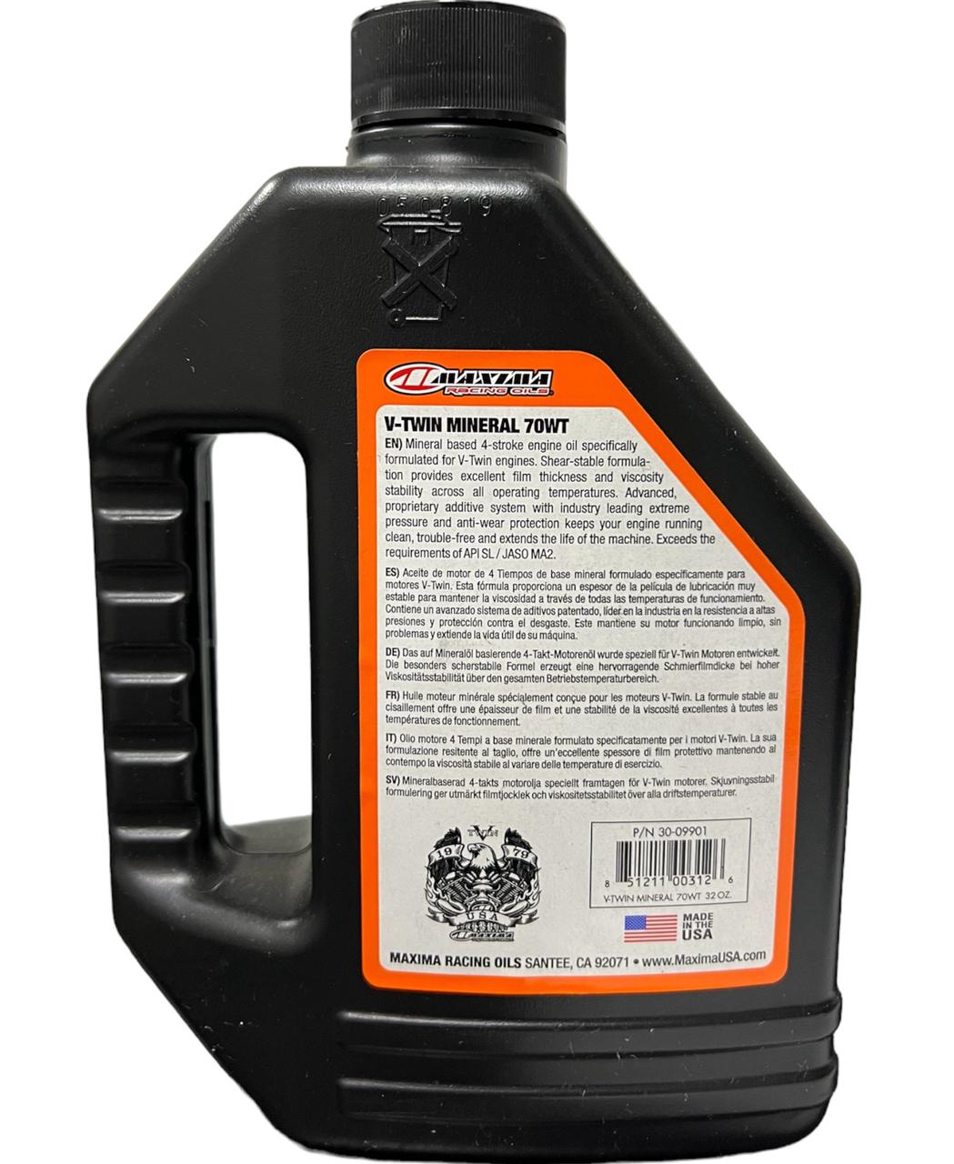 ACEITE MINERAL PARA MOTOS V-TWIN MAXIMA V-TWIN 70WT Específicamente formulado para motores V-Twin. La formulación estable al cizallamiento proporciona un excelente espesor de película y estabilidad de la viscosidad en todas las temperaturas de funcionamiento. El avanzado sistema de aditivos patentado con protección anti desgaste y presión extrema líder en la industria mantiene su motor funcionando limpio, sin problemas y prolonga la vida útil de la máquina. Supera los requisitos de API SL / JASO MA2