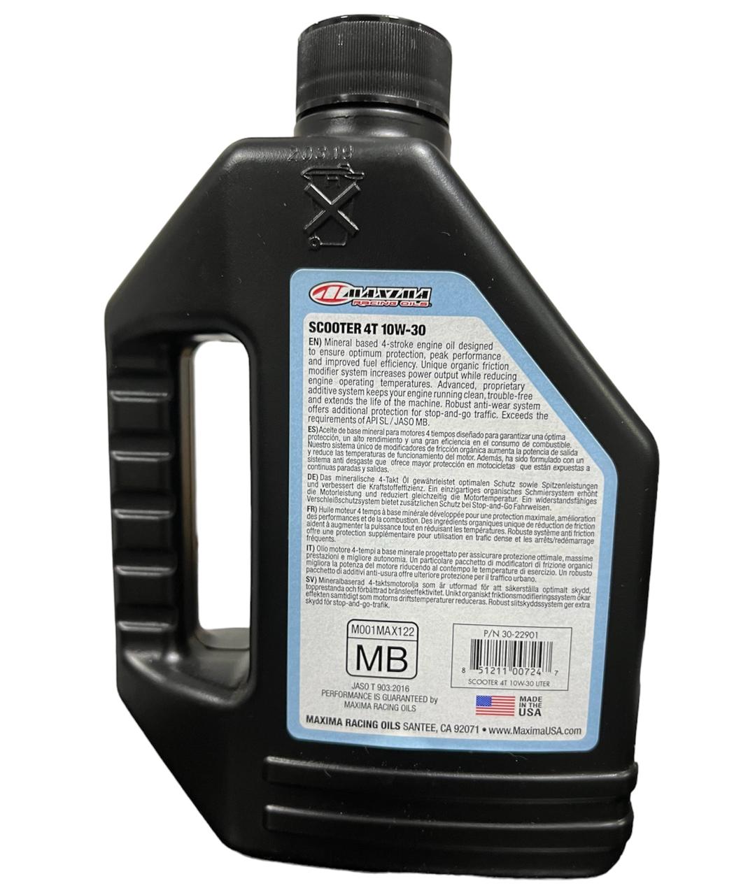 ACEITE MINERAL PARA SCOOTER MAXIMA SCOOTER 10W30 Diseñado para garantizar una protección óptima, un rendimiento máximo y una mayor eficiencia de combustible. El exclusivo sistema modificador de fricción orgánica aumenta la potencia al tiempo que reduce las temperaturas de funcionamiento del motor. El avanzado sistema de aditivos patentado mantiene su motor funcionando limpio, sin problemas y extiende la vida útil de la máquina. Supera los requisitos de API SL / JASO MB.