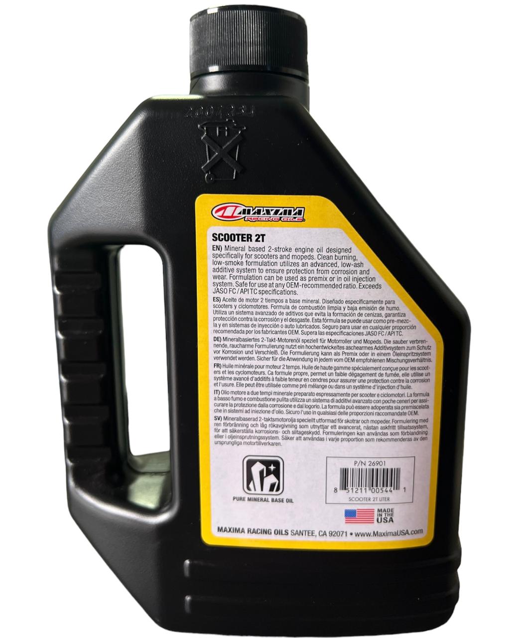 ACEITE MINERAL PARA SCOOTER MAXIMA SCOOTER 2T Diseñado para garantizar una protección y un rendimiento óptimos para scooters. La formulación de combustión limpia y baja emisión de humo utiliza materiales base de alta calidad y aditivos antidesgaste para proteger las partes críticas del motor y al mismo tiempo ayudar a controlar las temperaturas del mismo. El avanzado sistema de aditivos con bajo contenido de cenizas minimiza la acumulación de carbono al tiempo que evita la oxidación, la corrosión y el desgaste. Supera las especificaciones JASO FC / API TC