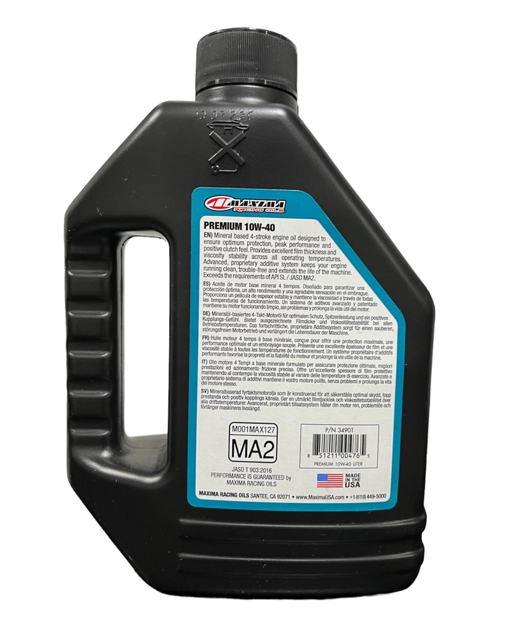 ACEITE MINERAL PREMIUM MAXIMA PREMIUM 10W40 Diseñado para garantizar una protección óptima, un rendimiento máximo y una sensación de embrague espectacular en todo tipo de cilindradas. El avanzado sistema de aditivos patentado mantiene su motor funcionando limpio, sin problemas y extiende la vida útil de la máquina. Supera los requisitos de API SL / JASO MA2.