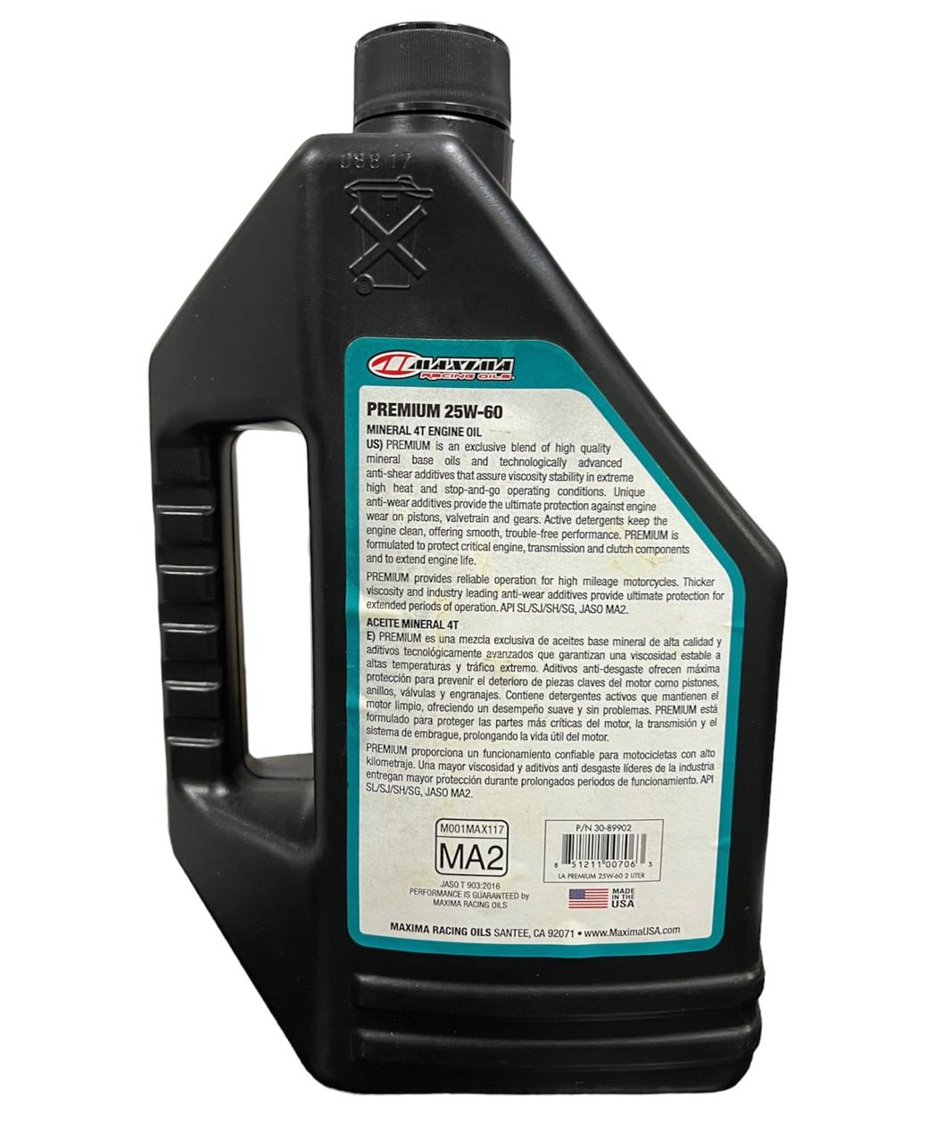 ACEITE MINERAL PREMIUM MAXIMA PREMIUM 25W60 Diseñado para garantizar la máxima protección para el ciclo de trabajo severo de un Moto Taxi. La formulación estable al cizallamiento protege los componentes críticos del motor minimizando la pérdida de viscosidad y manteniendo el espesor de la película de aceite bajo cargas elevadas. Supera los requisitos de API SL / JASO MA2.