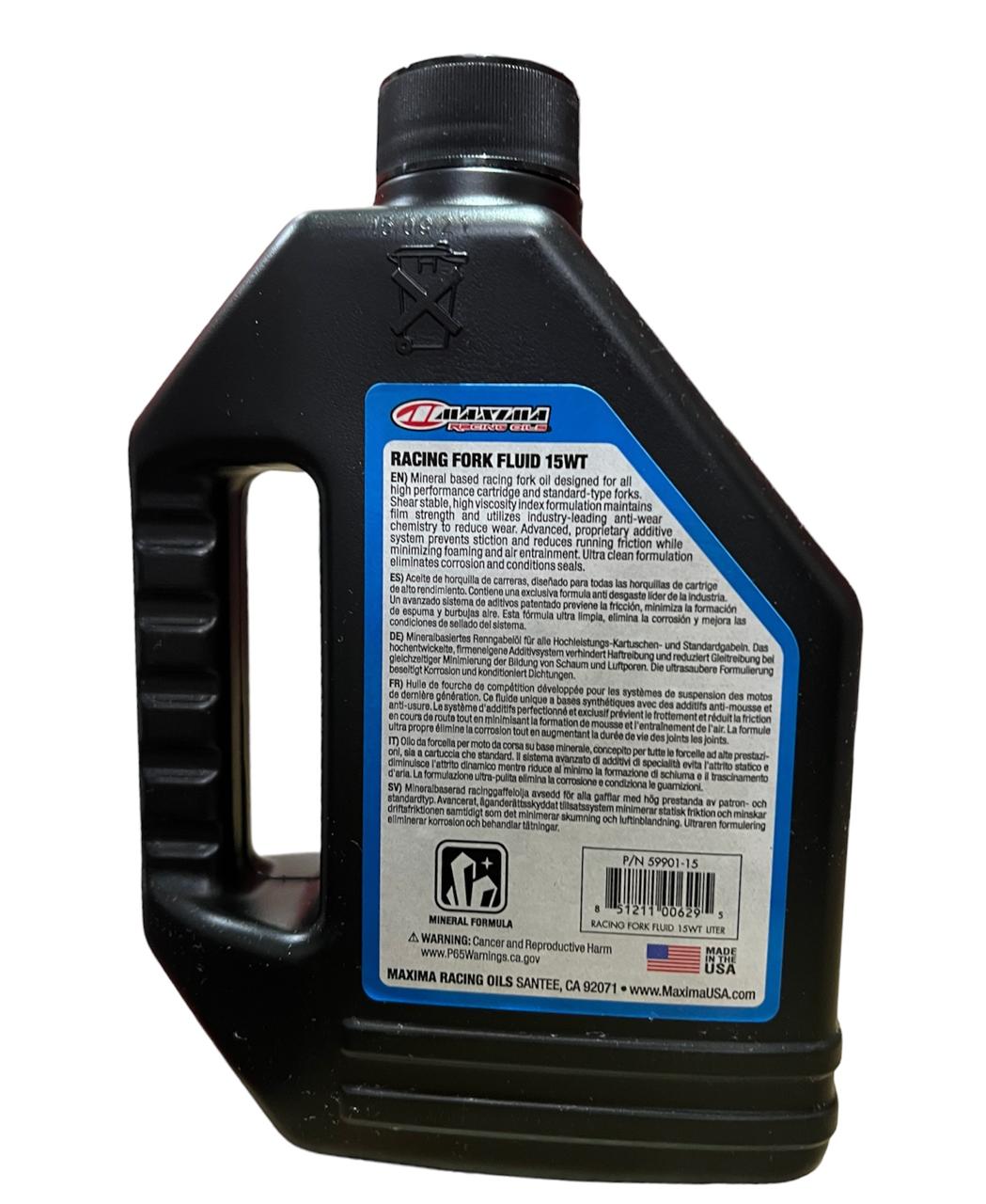 ACEITE PARA SUSPENSIONES DELATERAS DE MOTOS DE CARRERAS 15WT MAXIMA RACING FORK FLUID 15WT Aceite de horquilla de carreras a base de minerales diseñado para todos los cartuchos de alto rendimiento y horquillas de tipo estándar. La formulación de alto índice de viscosidad estable al corte mantiene la resistencia de la película protectora y utiliza una química antidesgaste líder en la industria para reducir el deterioro de las piezas. El avanzado sistema de aditivos patentado previene el roce y reduce la fricción de funcionamiento mientras minimiza la formación de espuma y el aire atrapado. La formulación ultra limpia elimina la corrosión y cuida los sellos.