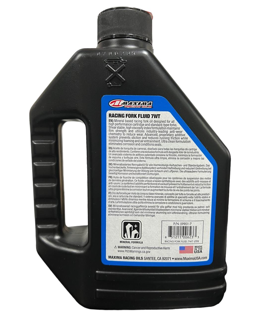 ACEITE PARA SUSPENSIONES DELATERAS DE MOTOS DE CARRERAS 7WT MAXIMA RACING FORK FLUID 7WT Aceite de horquilla de carreras a base de minerales diseñado para todos los cartuchos de alto rendimiento y horquillas de tipo estándar. La formulación de alto índice de viscosidad estable al corte mantiene la resistencia de la película protectora y utiliza una química antidesgaste líder en la industria para reducir el deterioro de las piezas. El avanzado sistema de aditivos patentado previene el roce y reduce la fricción de funcionamiento mientras minimiza la formación de espuma y el aire atrapado. La formulación ultra limpia elimina la corrosión y cuida los sellos.