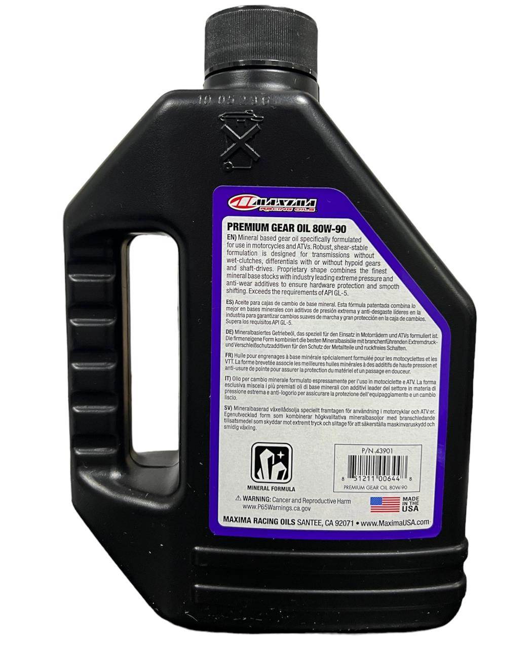 ACEITE PARA TRANSMISIONES MINERAL 80W90 MAXIMA 80W90 GEAR OIL Aceite para engranajes a base de minerales formulado específicamente para su uso en motocicletas y vehículos todo terreno. La formulación robusta y estable al corte está diseñada para transmisiones sin embragues húmedos, diferenciales con o sin engranajes hipoides y transmisiones de eje. La forma patentada combina las mejores existencias de base mineral con aditivos antidesgaste y de extrema presión líderes en la industria para garantizar la protección del sistema y un suave cambio de marchas.
