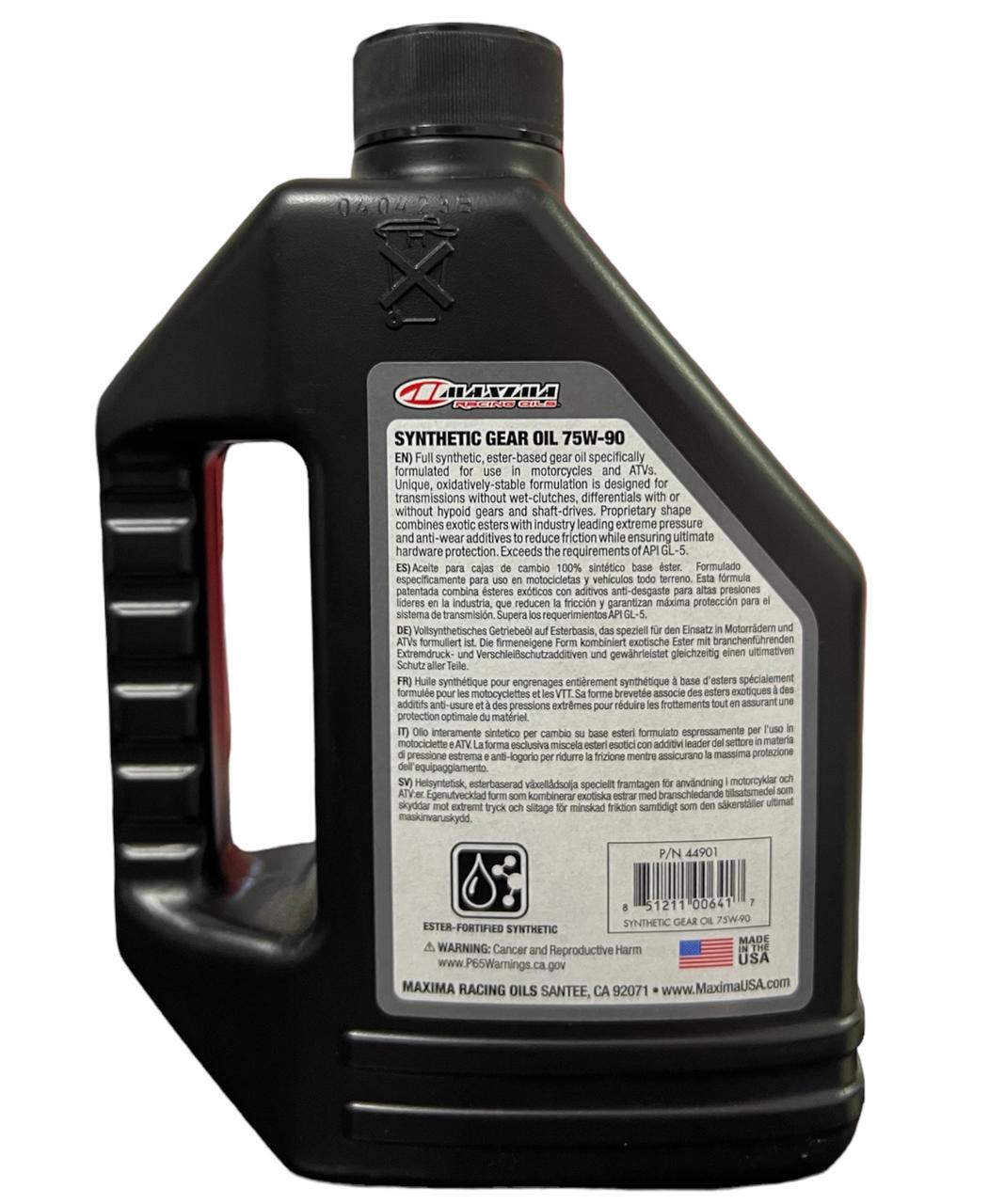 ACEITE PARA TRANSMISIONES SINTETICO 75W90 MAXIMA 75W90 SYN GEAR OIL Aceite sintético a base de éster formulado específicamente para su uso en motocicletas y vehículos todo terreno. La formulación única y oxidativamente estable está diseñada para transmisiones sin embragues húmedos, diferenciales con o sin engranajes hipoides y transmisiones de eje. La forma patentada combina singulares esteres con aditivos antidesgaste y de extrema presión líderes en la industria para reducir la fricción y garantizar la máxima protección del sistema. Supera los requisitos de API GL-5.