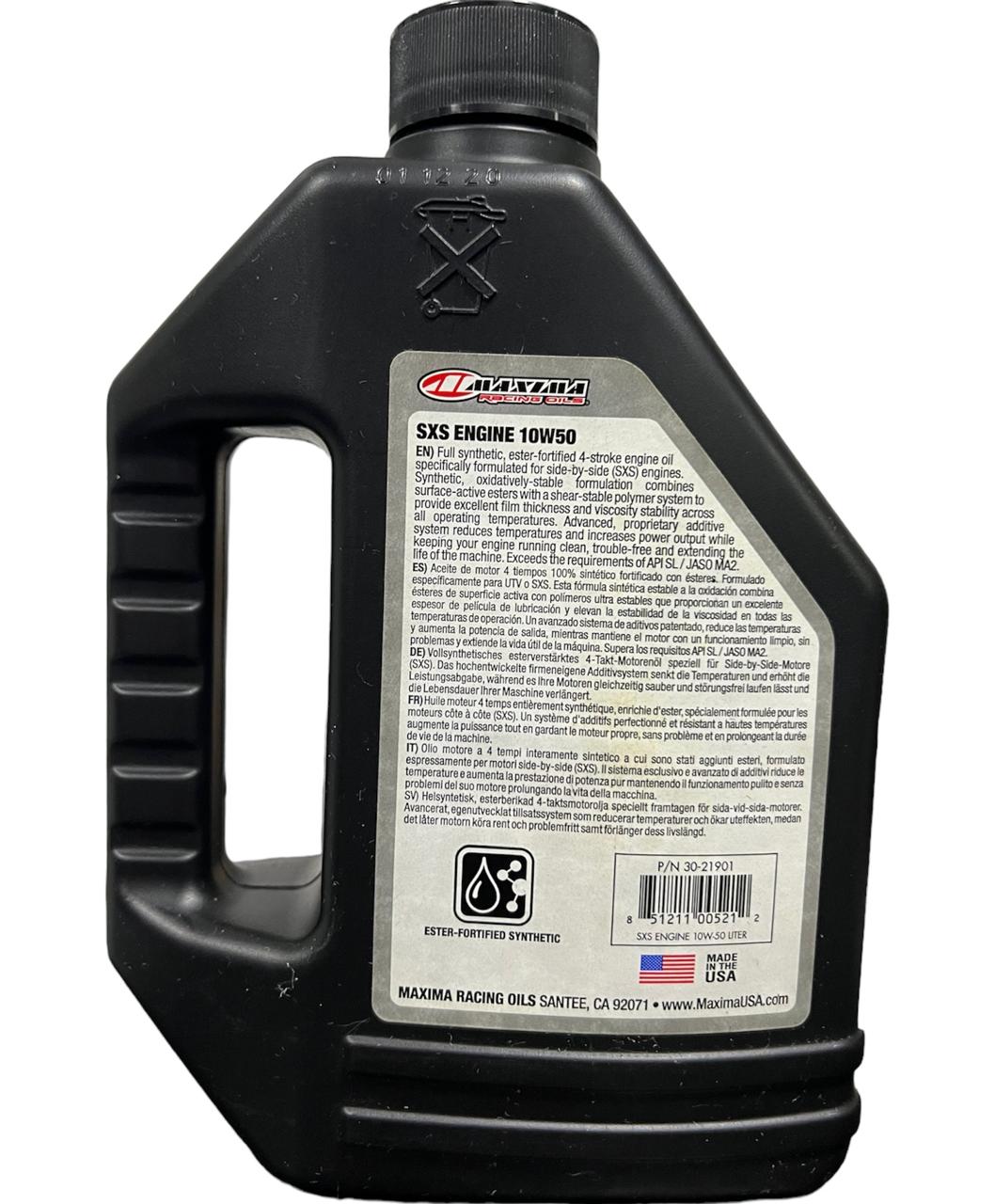 ACEITE SINTETICO PARA SIDE BY SIDE MAXIMA SXS ENGINE SYN 10W50 Formulado específicamente para motores side-by-side (SXS). La formulación sintética estable a la oxidación combina ésteres tensioactivos con un sistema de polímero estable al cizallamiento para proporcionar un excelente espesor de película y estabilidad de la viscosidad en todas las temperaturas de funcionamiento. El avanzado sistema de aditivos patentado reduce las temperaturas y aumenta la potencia de salida mientras mantiene el motor funcionando limpio, sin problemas y prolonga la vida útil de la máquina. Supera los requisitos de API SN PLUS / JASO MA2.
