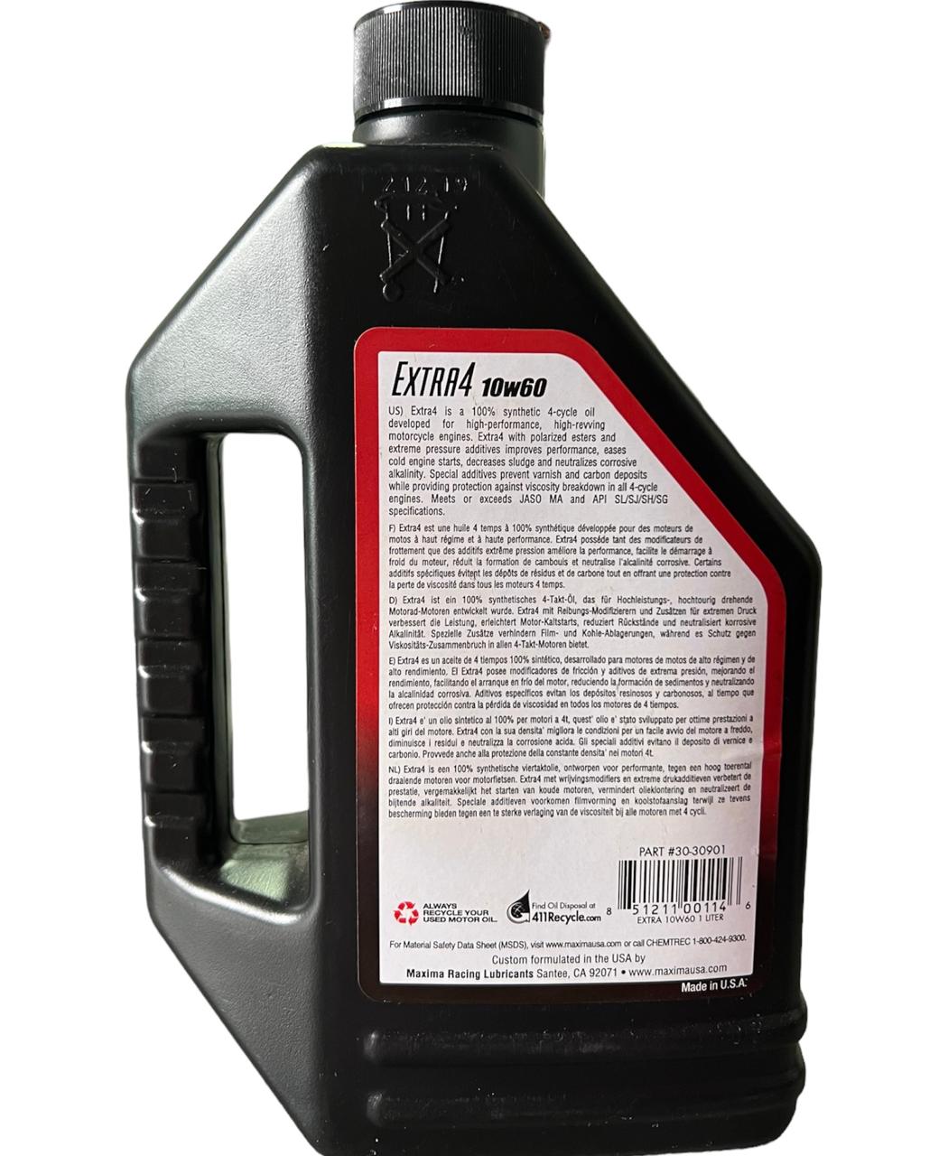 ACEITE SINTETICO TRIPE ESTER PARA MOTOS MAXIMA EXTRA 10W60 Diseñado para garantizar el máximo rendimiento al tiempo que proporciona la máxima protección en las condiciones más severas. La formulación ampliamente desarrollada posee una sinérgica de singulares esteres, polímeros regenerativos y el sistema de aditivos más avanzado del mundo para brindar una protección inigualable del motor, el embrague y el engranaje. Supera los requisitos de API SL / JASO MA.