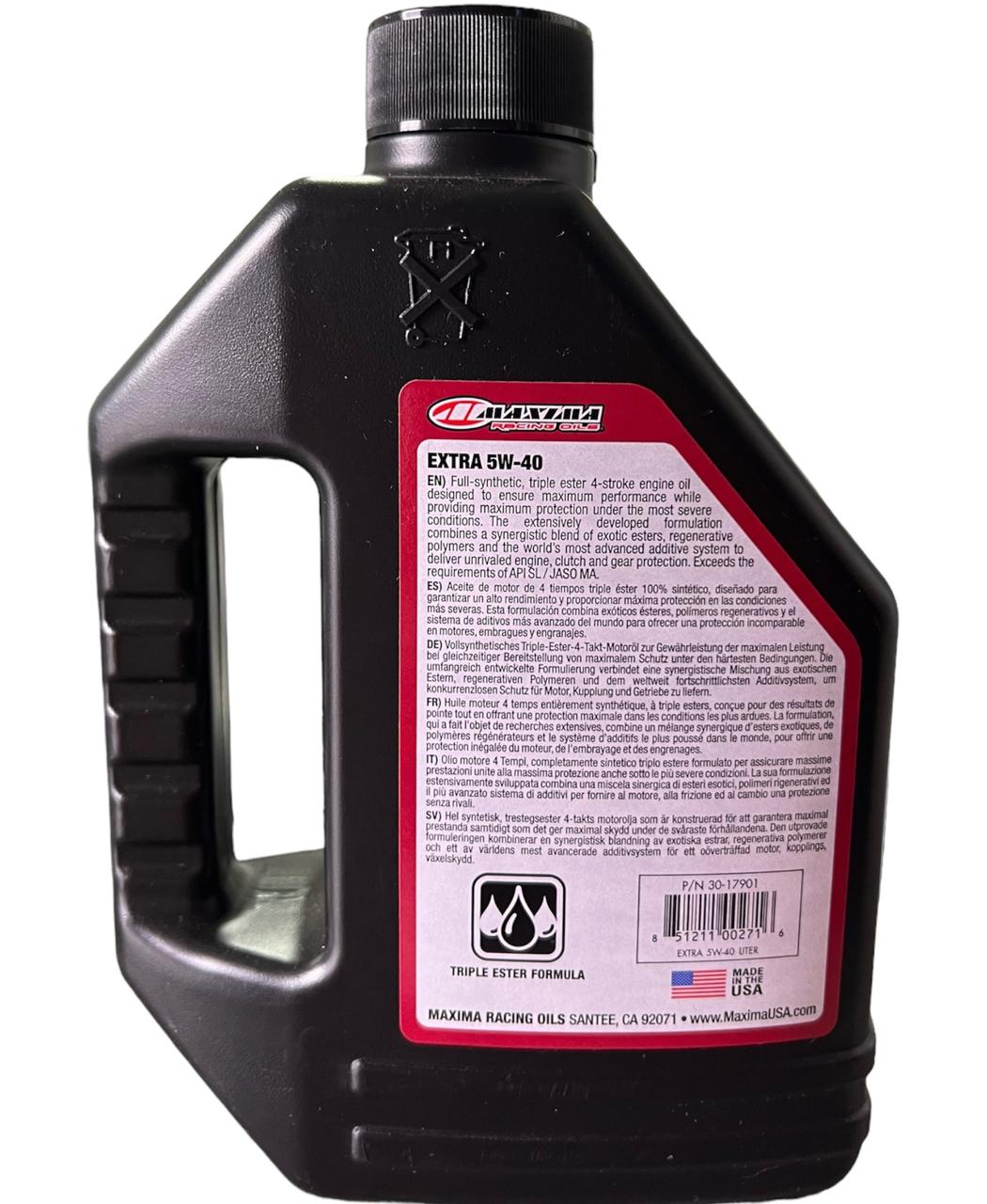 ACEITE SINTETICO TRIPE ESTER PARA MOTOS MAXIMA EXTRA 5W40 Diseñado para garantizar el máximo rendimiento al tiempo que proporciona la máxima protección en las condiciones más severas. La formulación ampliamente desarrollada posee una sinérgica de singulares esteres, polímeros regenerativos y el sistema de aditivos más avanzado del mundo para brindar una protección inigualable del motor, el embrague y el engranaje. Supera los requisitos de API SL / JASO MA.