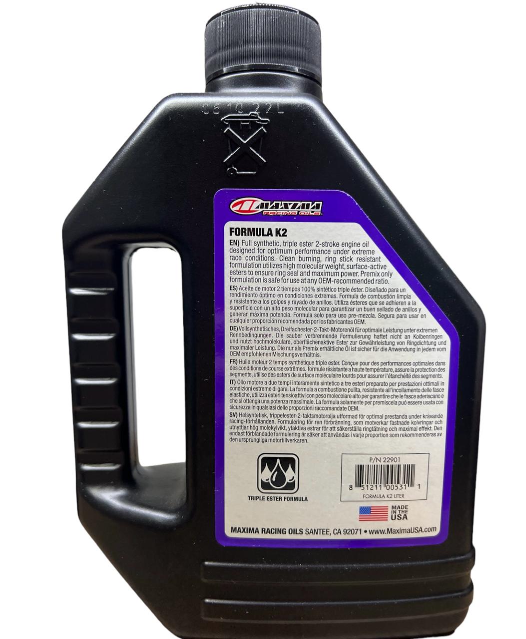 ACEITE SINTETICO TRIPLE ESTER PARA MOTOS 2T MAXIMA FORMULA K2 SYN Diseñado para garantizar una protección y un rendimiento óptimos en condiciones extremas. La formulación de combustión limpia y resistente a la adherencia del anillo utiliza ésteres tensioactivos de alto peso molecular para garantizar un sellado óptimo del anillo y la máxima potencia. El avanzado sistema de aditivos con bajo contenido de cenizas minimiza la acumulación de carbono al tiempo que evita la oxidación, la corrosión y el desgaste.