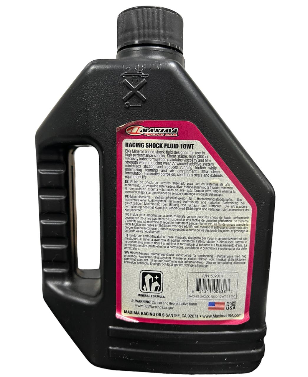 ACIETE PARA SUSPENSIONES TRASERAS DE MOTOS MINERAL HEAVY 10WT MAXIMA RACING SHOCK FLUID HEAVY 10WT Aceite de Shock a base de minerales diseñado para su uso en Shocks de alto rendimiento. La formulación de alto índice de viscosidad estable al corte (300+) mantiene la viscosidad y la resistencia de la película protectora mientras reduce el desgaste. El sistema de aditivos avanzado minimiza la fricción y reduce el roce al tiempo que minimiza la formación de espuma y la entrada de aire. La formulación ultra limpia elimina la corrosión, cuida los sellos y extiende la vida útil del equipo.