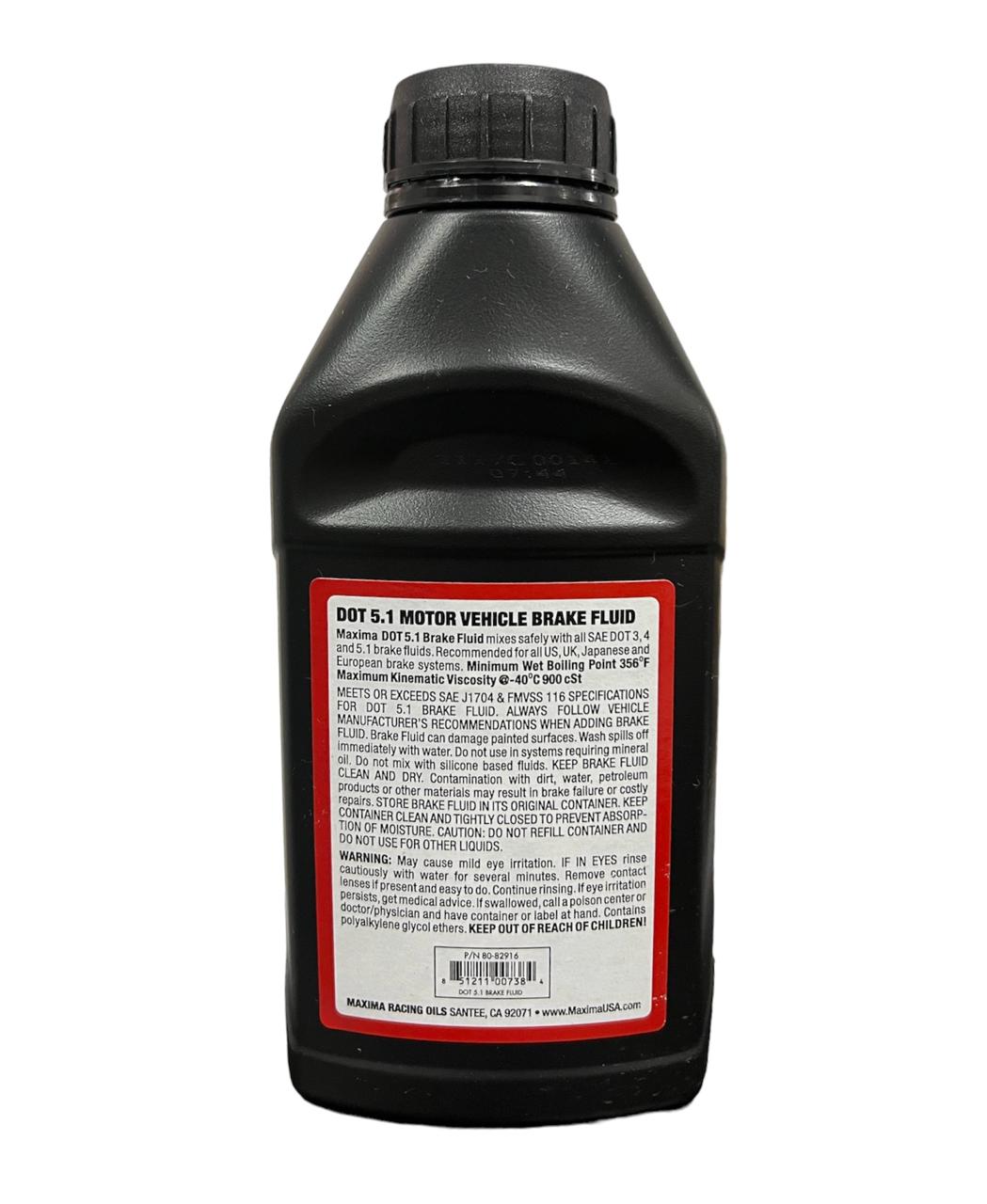LIQUIDO DE FRENOS DOT 5.1 MAXIMA DOT 5.1 BRAKE FLUID Líquido de freno y embrague de alto rendimiento diseñado para lubricar y proteger los componentes críticos del sistema de frenos al tiempo que proporciona una potencia de frenado confiable. La formulación de bloqueo anti-vapor mantiene la capacidad de respuesta y el rendimiento al combatir tanto la contaminación del agua como la vaporización. La tecnología avanzada de DOT 5.1 resiste la corrosión.
