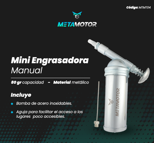 La mini engrasadora metálica Metamotor de 80 gramos es la herramienta ideal para quienes buscan aplicar grasa con exactitud y sin desperdicios. Fabricada en metal resistente, esta engrasadora incluye dos puntas de aplicación intercambiables:-